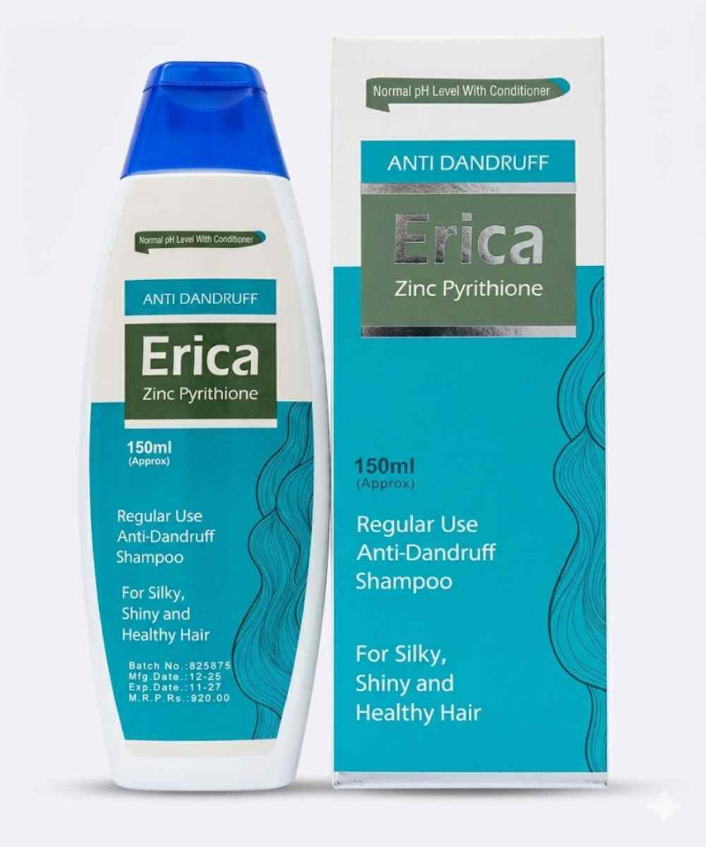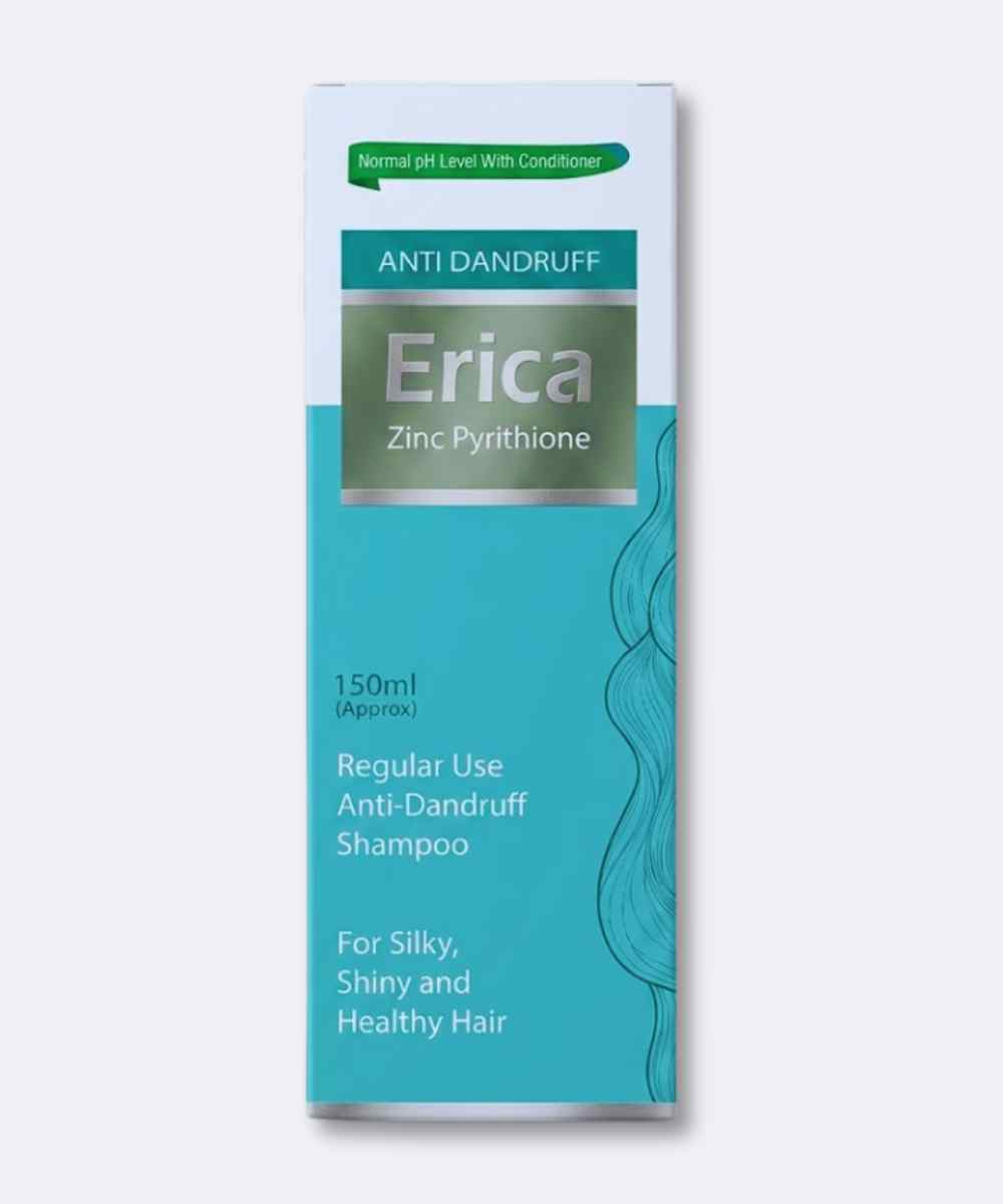 Scalp buildup, visible flakes, itching and dandruff can affect both comfort and hair appearance. Erica Zinc Pyrithione Anti Dandruff Shampoo is designed for regular scalp care and cleansing support while helping maintain silky, shiny and healthy-looking hair.
